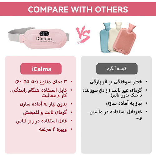 کمربند حرارتی iCalma یک محصول کاربردی برای تأمین گرمای یکنواخت و قابلحمل است. این کمربند با سه حالت حرارتی، جنس مخملی و باتری قابل شارژ، گزینهای مناسب برای استفاده روزانه و زمستانی محسوب میشود.